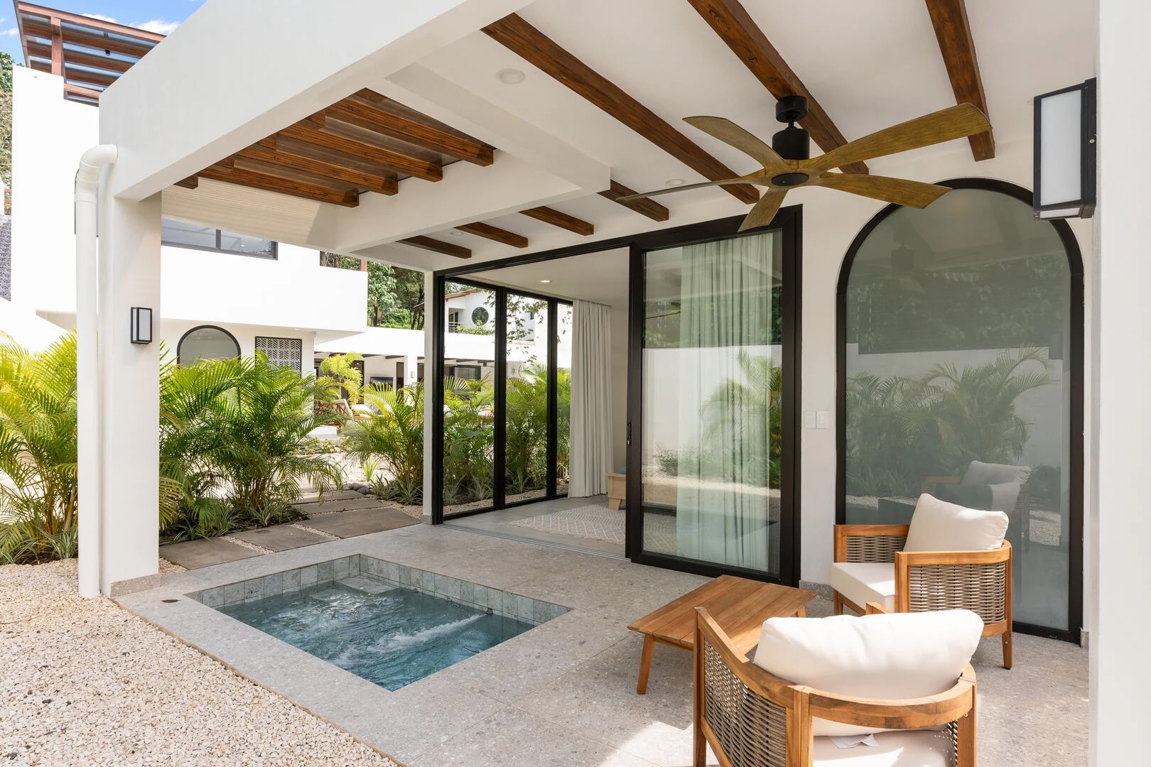 What sets it apart? For starters, two private pools. Multiple outdoor living areas – some sun-soaked, others shaded and breezy. An outdoor fire pit and dining space that feels made for starlit evenings. And all of it framed by swaying palms, lush greenery, and a canopy often visited by howler monkeys in the Guanacaste trees.